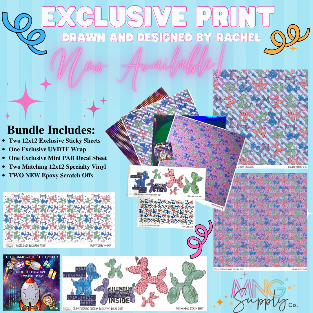 Rachel has drawn and created this 100% custom Pastel Balloon Dog Creative Set, that includes, Two 12x12 Exclusive Sticky Sheets One Exclusive UVDTF Wrap One Exclusive Mini PAB Decal Sheet Two Matching 12x12 Specialty Vinyl TWO NEW Epoxy Scratch Offs.
